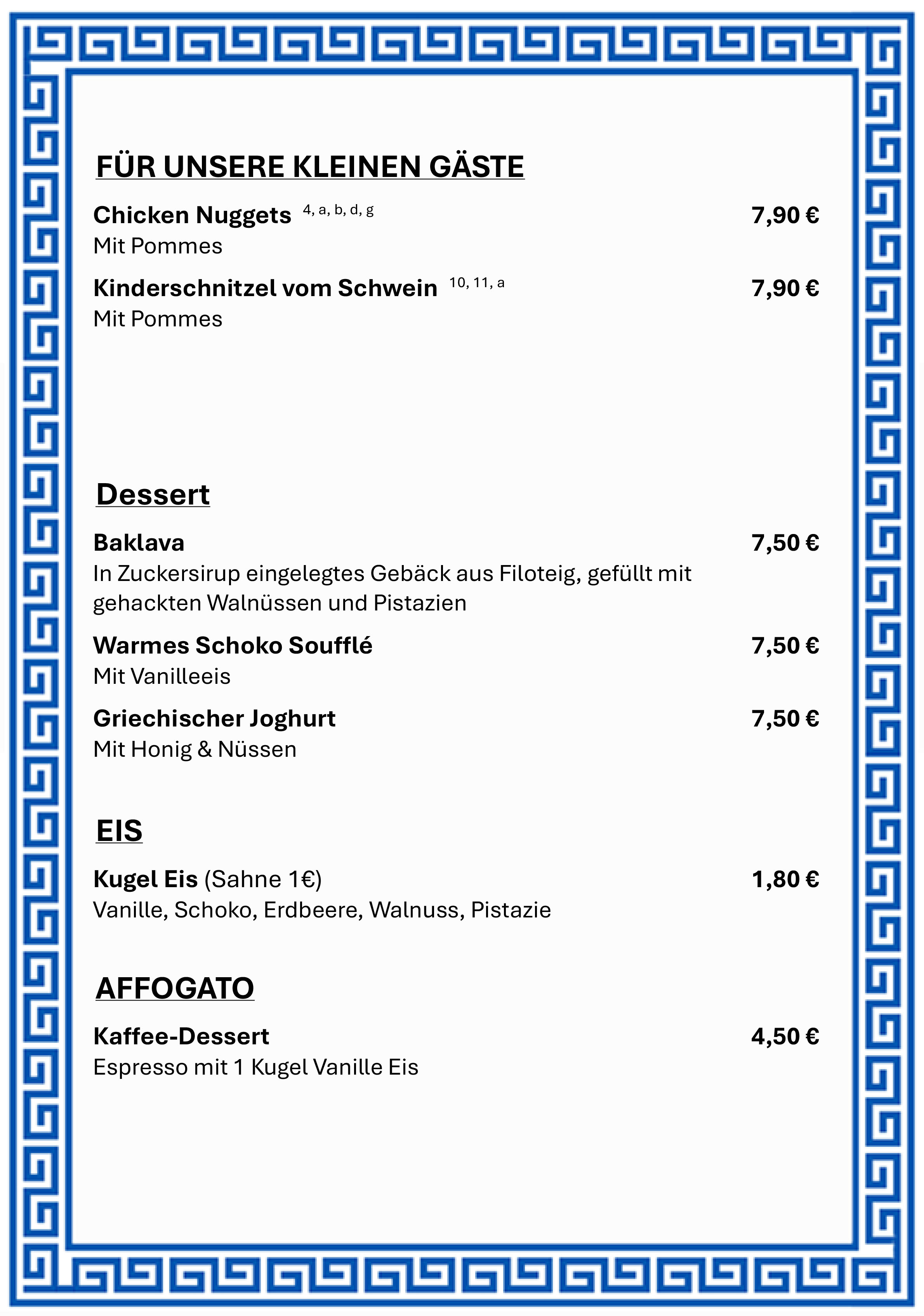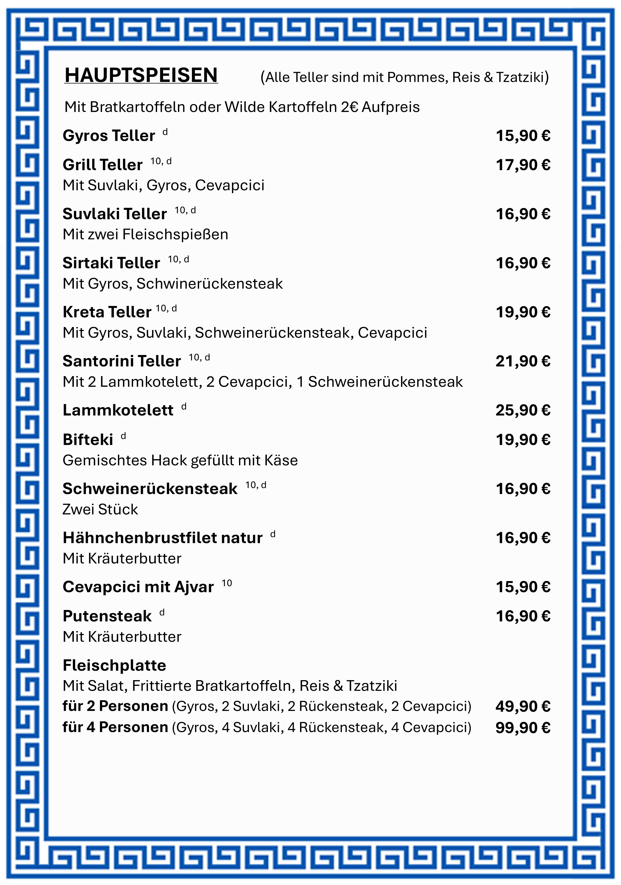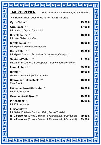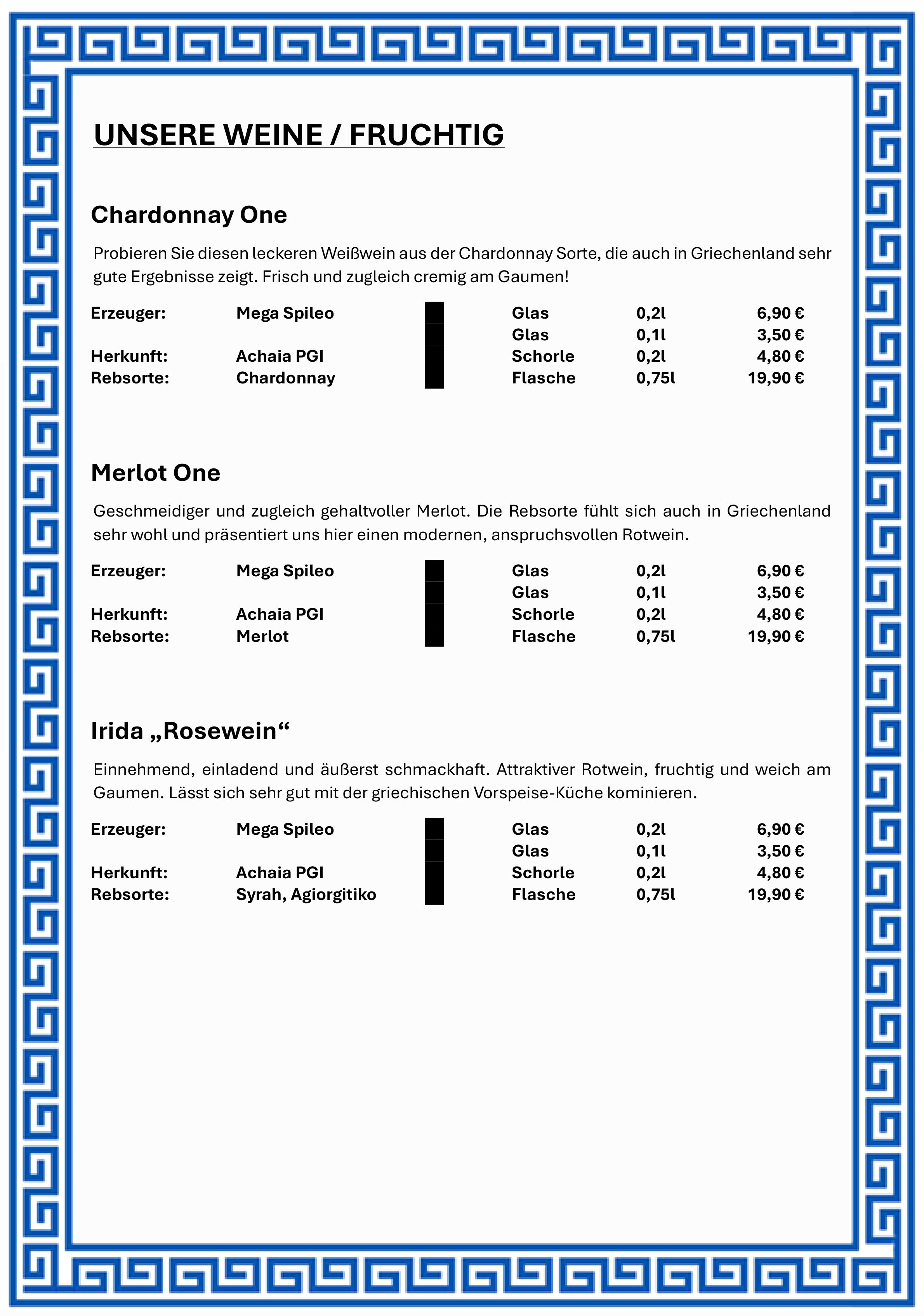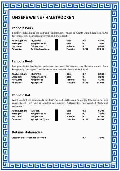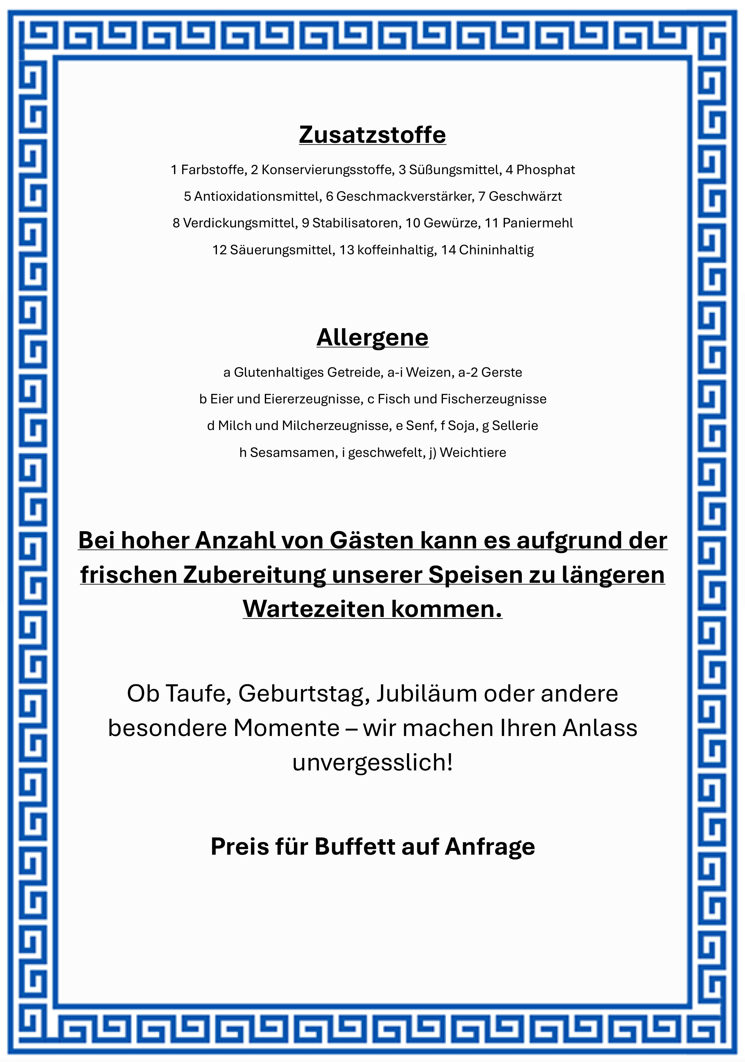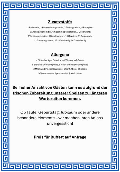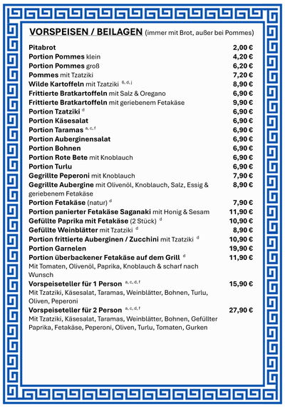 Bitte beachten Sie, dass es bestimmte Speisen nur auf Vorbestellung gibt, z.B. Fischplatte, Sardellen oder Rotbarbe. Bitte setzen Sie sich diesbezüglich vorab mit uns in Verbindung.