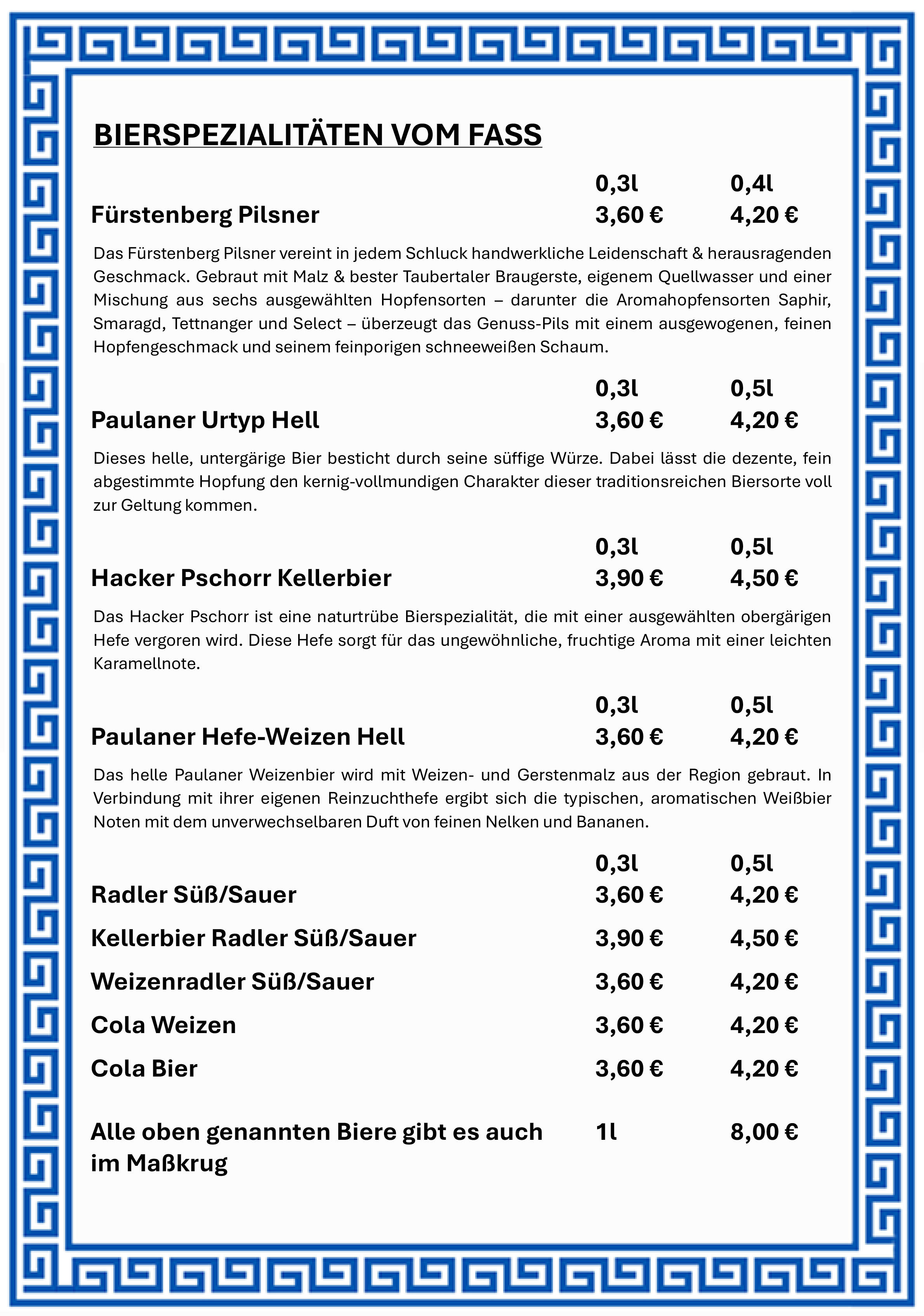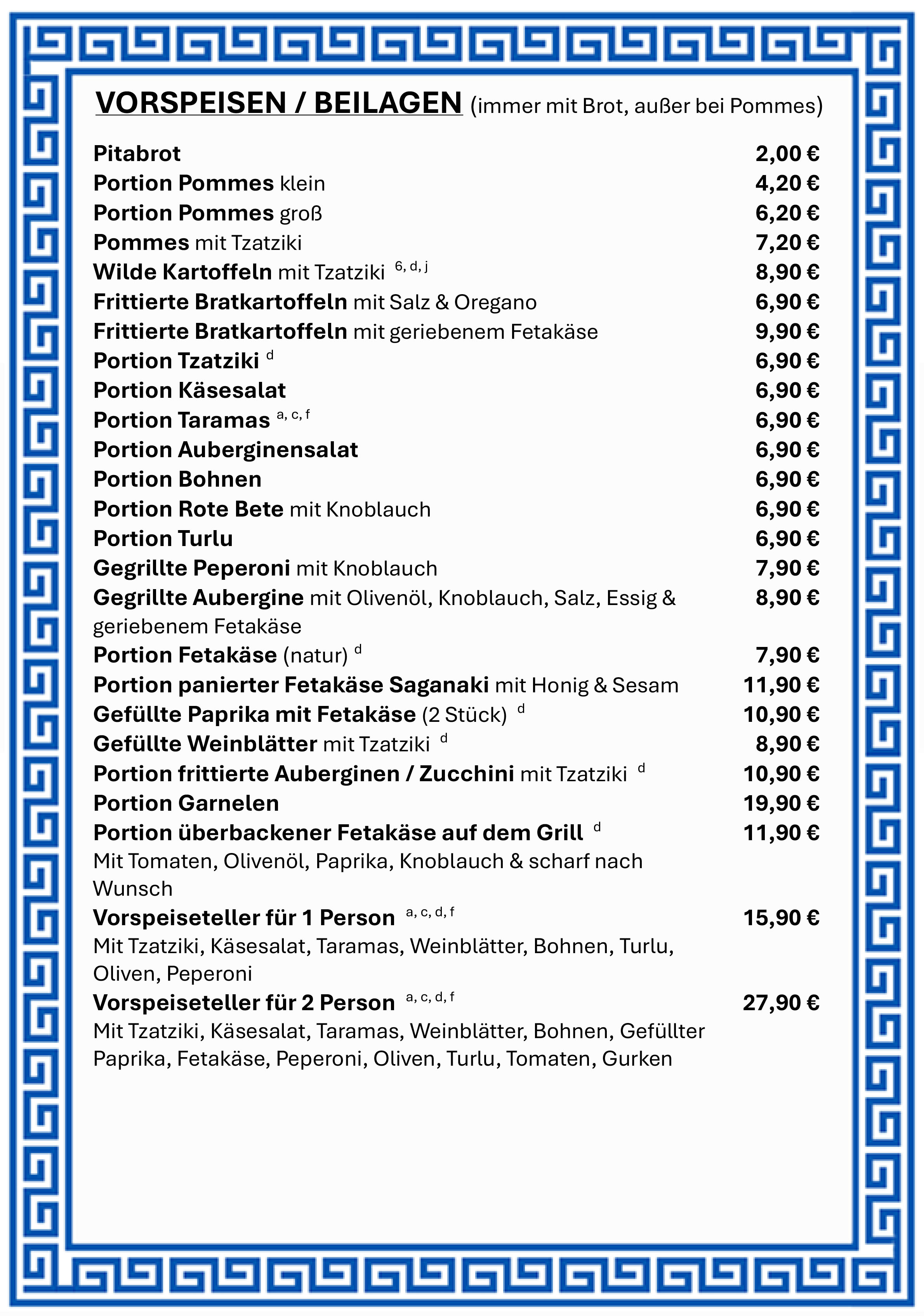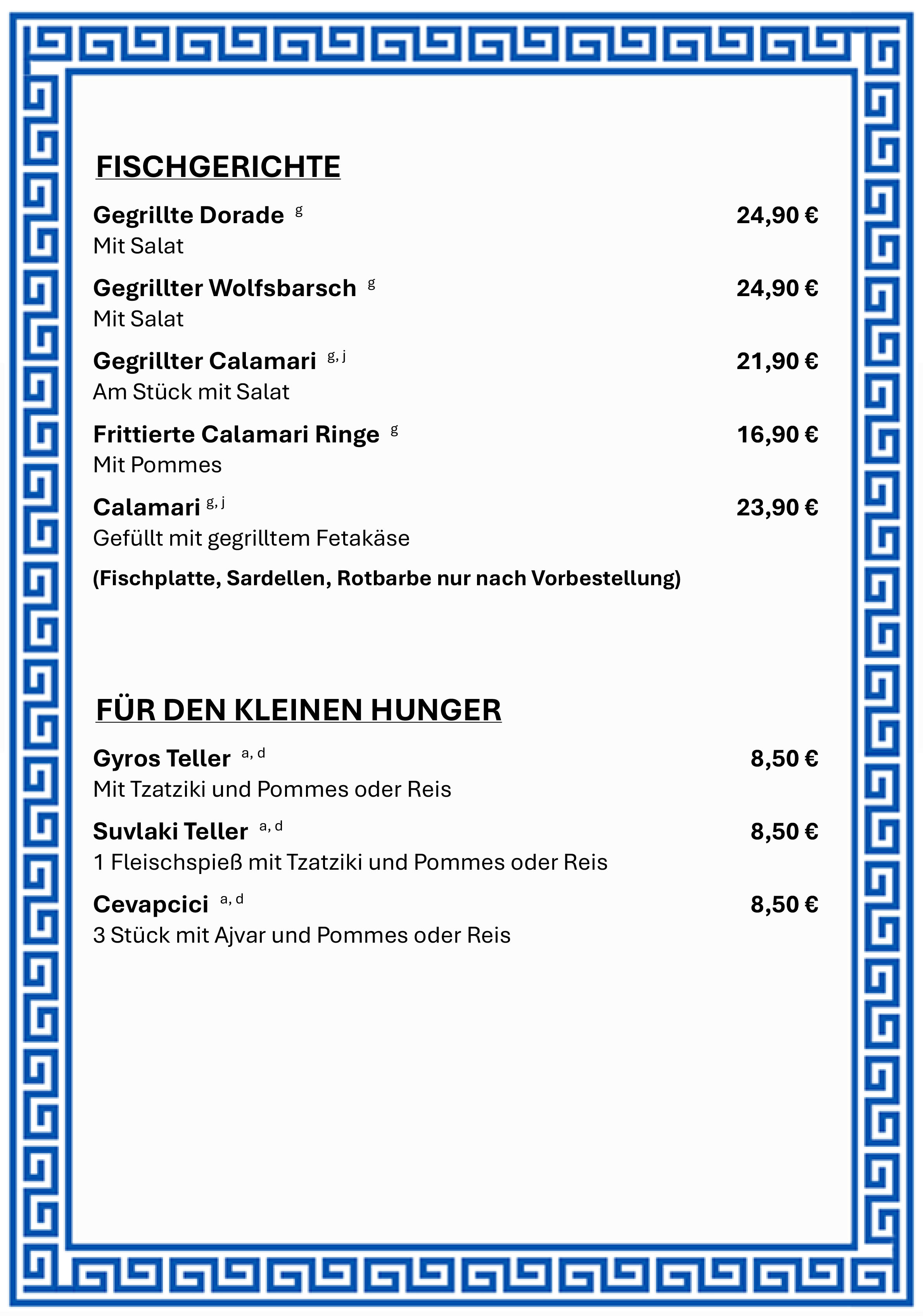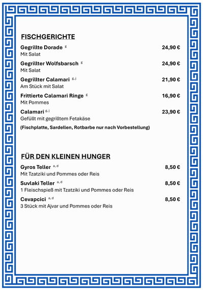 Bitte beachten Sie, dass es bestimmte Speisen nur auf Vorbestellung gibt, z.B. Fischplatte, Sardellen oder Rotbarbe. Bitte setzen Sie sich diesbezüglich vorab mit uns in Verbindung.